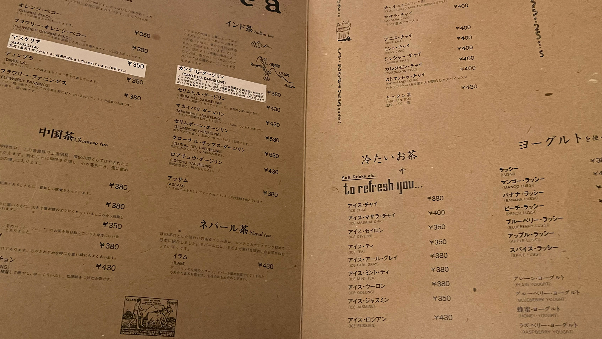 梅田の店を中心に行列ができるほど忙しかった全盛期でも、ゆったりとした空気が流れていた中津本店では特にチャイはこだわりをもって淹れられていたが、経営者が変わり様々な取り組みを進める中で、ジンジャーチャイを頼むとプレーンチャイにジンジャーの粉が付いてくるようになった。ただスパイスチャイは80年代のメニューとほとんど変わらず、ミントチャイが無くなった以外はマサラチャイ、アニスチャイ、ジンジャーチャイ、カルダモンチャイ、カトマンズチャイなど現存していて、加えてアイスチャイとは別にチャイフロートなんていうものもあり、進化も見られる。